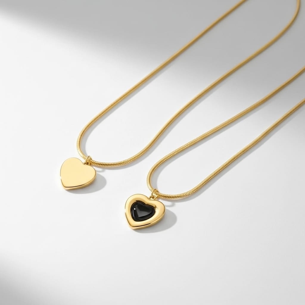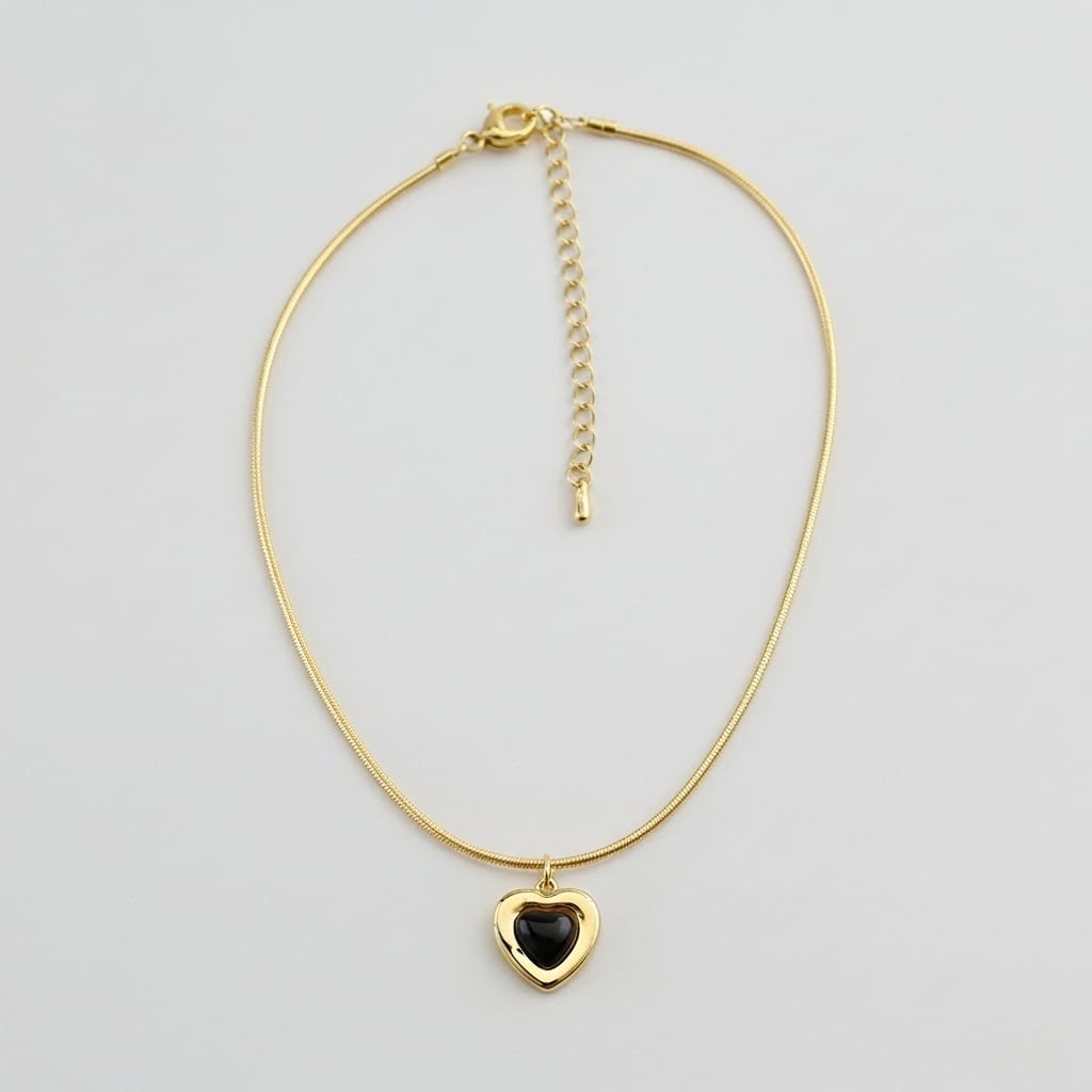 Cuore bombato con Onice nera, con catena snake chain elegante, sottile e lucidato in oro caldo.